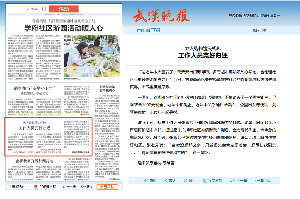 “这老年卡太重要了,我天天出门都得用。多亏超市那姑娘热心帮忙,也谢谢社区心里装着咱老百姓!”近日,武汉东湖高新区关东街道雄庄社区的刘阿姨提起钱包失而复得的经历,语气里满是感激。
